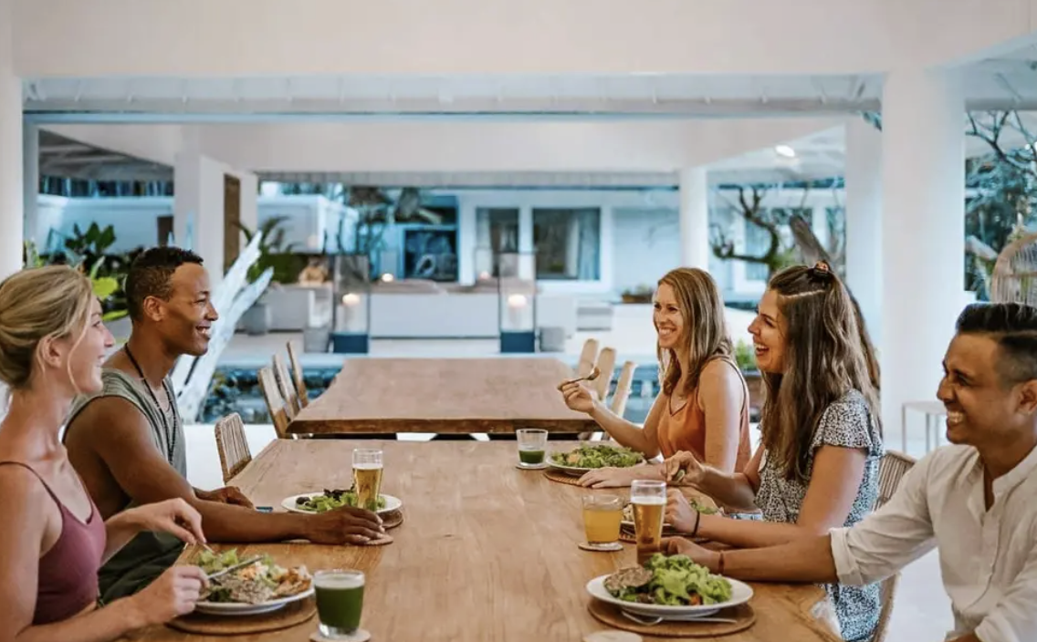 • During: coffee with ocean views, high-speed wifi by the pool, yoga, surf, and community dinners.