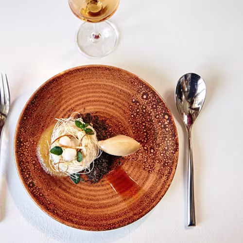 If you ever find yourself in Elciego, the dining scene at the Hotel Marqués de Riscal is reason enough to linger a little longer. The signature Marqués de Riscal Gastronomic Restaurant elevates fine dining with creativity and flair, while 1860 Tradición offers comfort dishes reimagined with a modern twist, each plate framed by sweeping views of the Sierra de Cantabria. For something more casual, the Vinoteca & Bistro invites you to savor the estate’s celebrated wines paired with light bites, and The Library Lounge, perched high above the vineyards, provides a stylish spot to unwind with coffee, a cocktail, or a glass of Rioja.